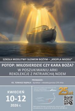 W ramach Tygodnia Miłosierdzia Bożego proponujemy sesję dotyczącą tego tematu w nowej odsłonie. Mnóstwo osób w historii poświęciło niemal swoje życie na poszukiwaniu Arki Noego. Do dzisiaj bardzo mało wiemy na jej temat. Jednak bardzo ciekawe jest duchowe przesłanie dotyczące tego biblijnego tematu. Arka była słowem Boga do ludzkości, przejawem Jego niezgłębionego miłosierdzia w poszukiwaniu człowieka. W czasie sesji rekolekcyjnej będziemy poszukiwaczami ARKI=SŁOWA miłosiernego Boga, zgłębiając tajemnicę Jego działania. Pójdziemy za Noem drogą posłuszeństwa Słowu Boga. Jest to droga bardzo fascynująca i realna, budząca wiele pytań i dająca odpowiedzi. Rekolekcje mają charakter dynamiki lectio divina czyli słuchania słowa Pana Boga.