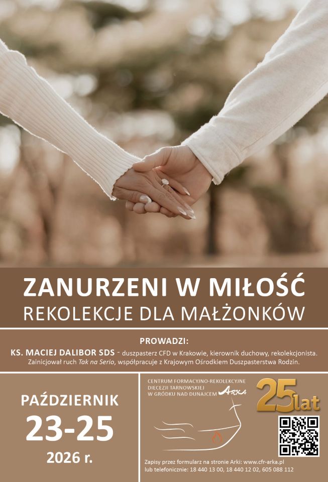 PROWADZĄ: Ks. Maciej Dalibor SDS – salwatorianin, duszpasterz Centrum Formacji Duchowej w Krakowie, kierownik duchowy, rekolekcjonista. W 2014 r. z grupą studentów zainicjował ruch Tak na Serio, który każdego roku organizuje Tydzień Modlitw za powołanych do małżeństwa. Kieruje także modlitewnym centrum pomocy powołanym do małżeństwa Pomoc na Serio, współpracuje z Krajowym Ośrodkiem Duszpasterstwa Rodzin. W każda niedzielę (wrzesień-czerwiec) w ramach #niedzielanaserio publikuje m.in. w kanałach streamingowych refleksję nad słowem Bożym dedykowaną małżeństwom. Prowadzącymi rekolekcje będzie także małżeństwo.